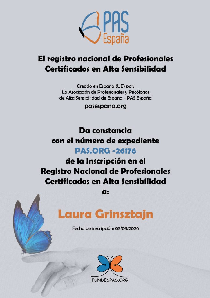 Y si necesitas ayuda, no dudes en ponerte en contacto conmigo ya que estoy Certificada como Profesional en Sensibilidad del Procesamiento Sensorial y Personas Altamente Sensibles. https://pasespana.org/listado-profesionales-pas/name/laura-grinsztajn/